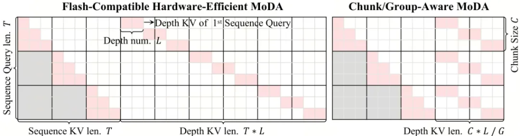把所有历史层的 KV 全塞进注意力,计算量会爆炸。一个 32 层的模型,第 32 层要看前 31 层的所有 KV,等效序列长度直接扩大 32 倍。MoDA 的工程核心是一套"分组重排"策略,只选一部分历史层的 KV,按组重新排列到连续显存上,让 GPU 的矩阵乘法能高效执行。