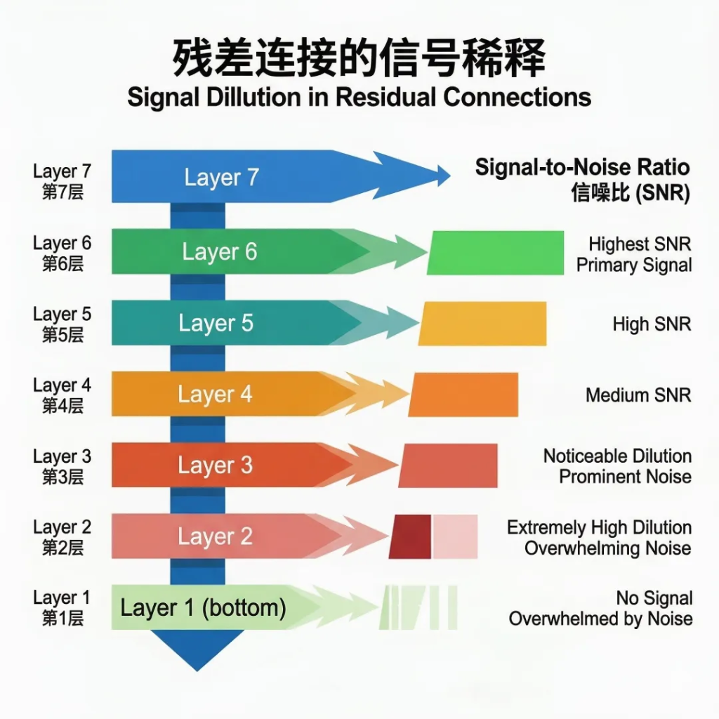 原因和残差连接的工作方式直接相关。每一层的输出通过残差连接加到一条"主干道"上。随着层数增加,主干道上累积的信号越来越大(可以理解为"背景音量"不断升高),但每一层新产生的信号幅度是有限的。到了深层,新信号就淹没在背景噪音里了,输入和输出几乎一样,这一层形同虚设。