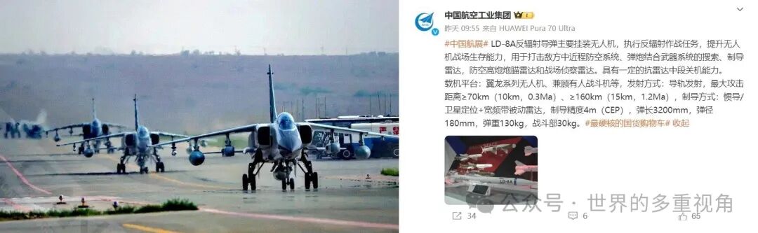 像 LD-8A 这种反辐射导弹,射程超过 160 公里,重量 130 公斤,绝对可以挂在歼轰 - 7A 的翼梢挂点。