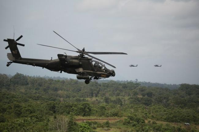 去年在印度尼西亚,美国陆军一架直升机正在参加一场多国军事演习。图片来源:PERDIANSYAH/AFP/GETTY IMAGES
