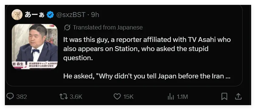 从日本社交网络的帖文来看,高市的支持者在过去的几个小时里一直在用十分恶毒的语言攻击这位资深记者,认为他问了一个“愚蠢”的问题,刺激了特朗普,这才导致特朗普当着高市的面说出了珍珠港,令日本受辱。