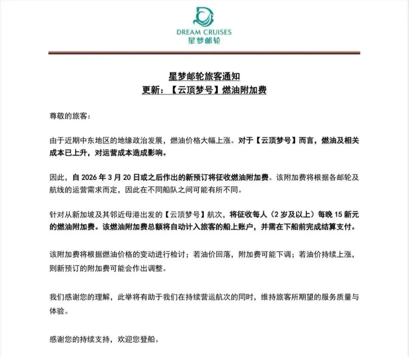 星梦邮轮旗下的云顶梦号一封通知显示,因中东地缘政治导致燃油价格大幅上涨,自3月20日起,新预订的云顶梦号航次将对每位旅客征收每晚15新币(约75元人民币)的燃油附加费,且2岁以上一视同仁。