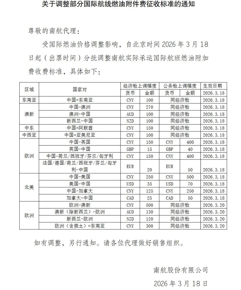 南航已经向代理渠道发调价通知了,包括中国—东南亚航线上调100元,中国—澳洲航线上调270元,中国—美国航线经济舱上调250元、公务舱上调500元。