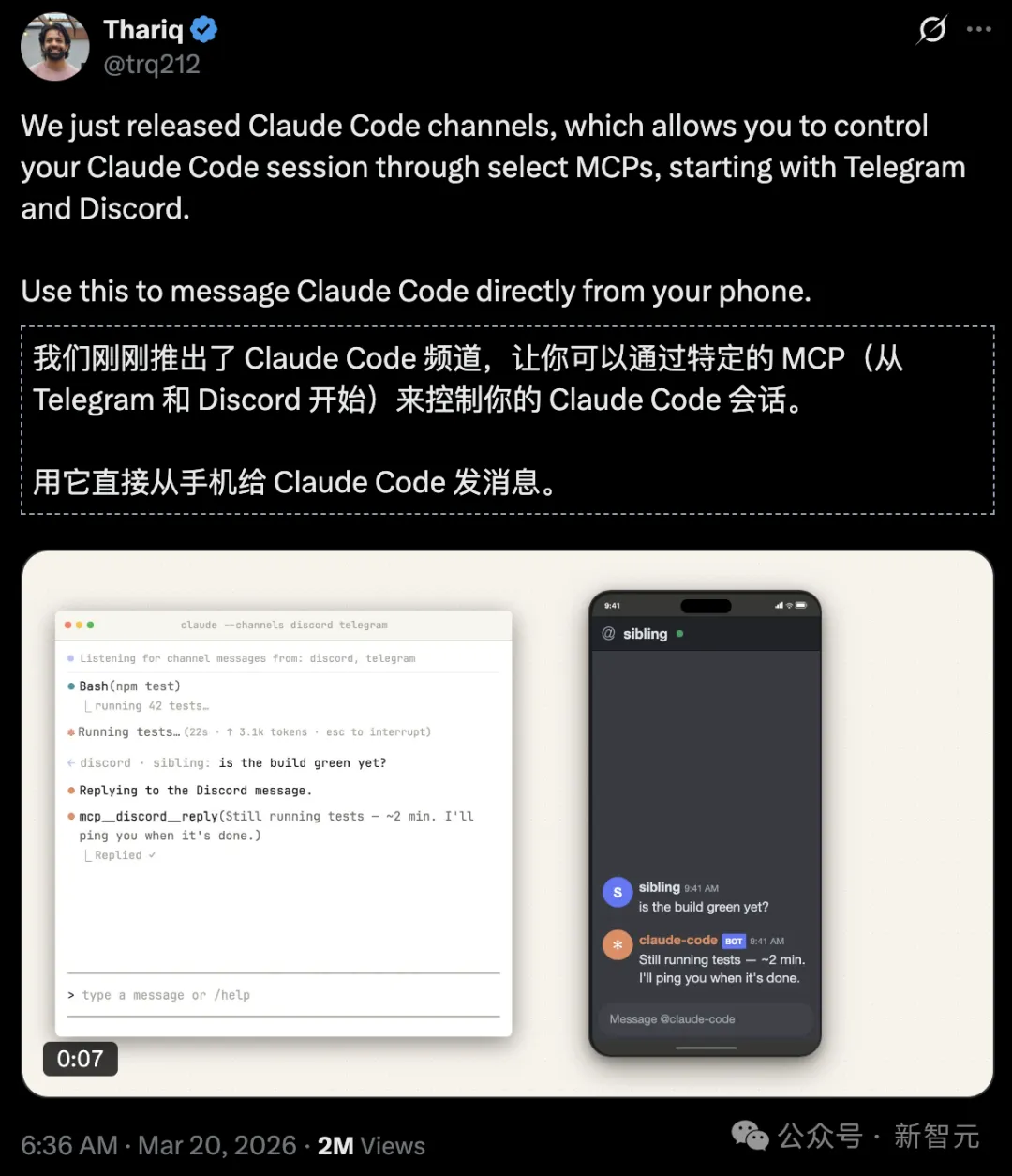 Claude Code又上杀手锏!新增Channels功能,Telegram/Discord直连编程会话,手机直接遥控AI写代码。