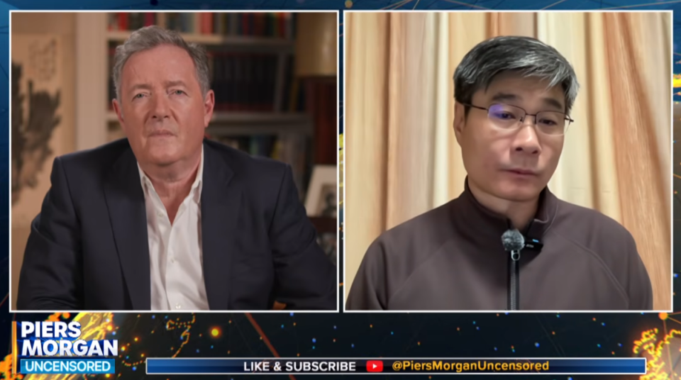 ·江学勤(右)在节目中与皮尔斯·摩根对谈。(视频截图)