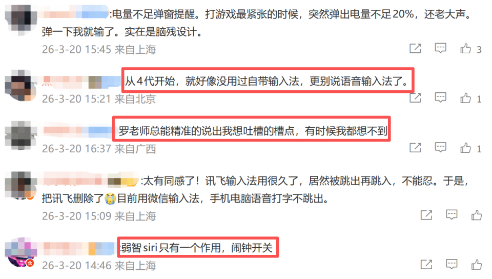 除了语音输入法和 Siri 以外,苹果充电口设计、续航能力、系统封闭性等问题也难逃罗永浩“毒舌”。主打一个我是用户,我用着有问题,那我就必须要指出问题。