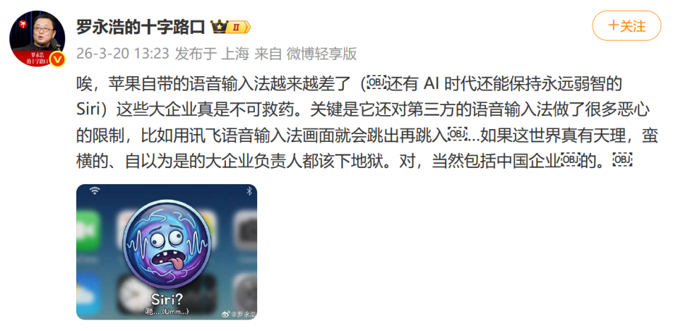 苹果又被怼:罗永浩炮轰其语音输入法雷科技