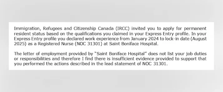 加拿大移民、难民及公民部(IRCC)的拒信指出,其申请材料中关于工作职责的证据“不足”。