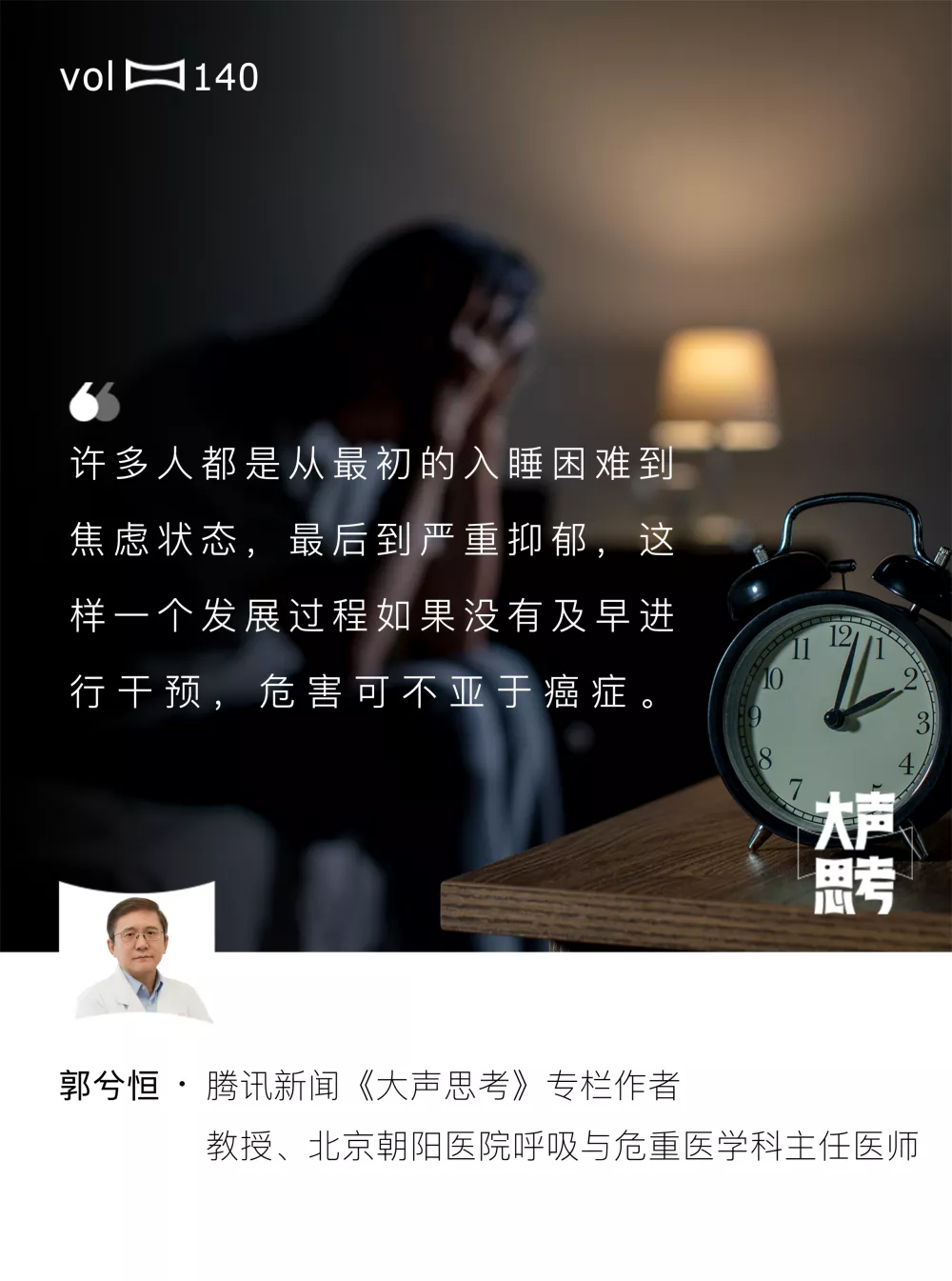 其实问题很简单,就是睡不好觉,导致他精神崩溃,出现严重抑郁。许多人都是从最初的入睡困难到焦虑状态,最后到严重抑郁,这样一个发展过程如果没有及早进行干预,不能够改善患者的焦虑抑郁情绪的话,对他的危害可不亚于癌症,也不亚于任何其他的严重疾病。
