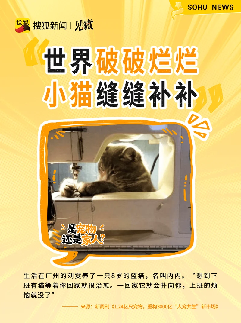 “世界破破烂烂,小猫缝缝补补。”生活在广州的刘雯养了一只8岁的蓝猫,名叫内内。“想到下班有猫等着你回家就很治愈。一回家它就会扑向你,上班的烦恼就没了”,刘雯说,“你可以疯狂吸猫,撸猫,对着它碎碎念,加班的时候还会躺在旁边陪着你,幸福感真的很高”。