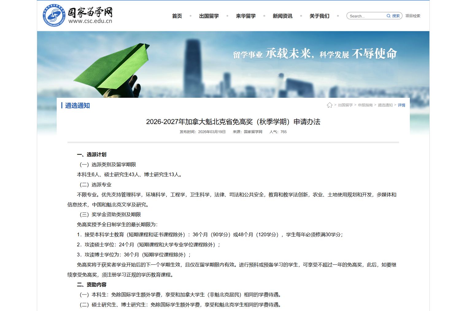 加拿大魁北克省免高奖开始申请国家留学基金管理委员会