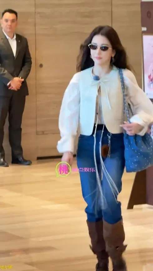 她穿着一件白色外套,袖子宽大到显得整个人臃肿,下身搭配普通牛仔裤,脚踩棕色长筒靴。卷发披肩,背着普通帆布包,整体造型显得随意甚至有些潦草。本来方媛身高不低,可这套穿搭完全没有凸显她的优势,反而让她显得矮胖,与她以往的时尚感大相径庭。