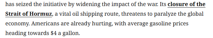 文章说,尽管美国和以色列无疑已对伊朗造成了巨大破坏,但伊朗通过扩大战争影响范围,成功掌握了主动权。伊朗关闭了重要的石油运输通道霍尔木兹海峡,这一举动可能使全球经济陷入瘫痪。美国民众已深受其害,汽油平均价格正逼近每加仑4美元。