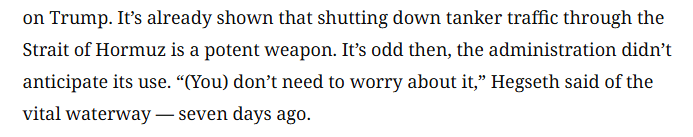 文章分析说,伊朗或许会在军事上落败,但它“正在打赢属于自己的战争”。事实证明,伊朗关闭霍尔木兹海峡是一柄利器。伊朗让世界其他地区付出了经济代价,从而对美国政府形成政治压力。令人费解的是,美国政府竟未预判到这一手段的运用。就在几天前,美国国防部长赫格塞思谈及这条关键水道时还表示“(你们)无需为此担忧”。
