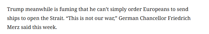 文章称,海湾国家连续数天遭遇导弹和无人机警报,而这一威胁源于他们的盟友美国发动的一场他们并不希望发生的战争。与此同时,美国总统特朗普因多次催促欧洲国家参与霍尔木兹海峡护航行动未果而大为恼火。但欧洲的态度仍然没有实质性改变。本周早些时候,德国总理默茨表示:“这不是我们的战争。”
