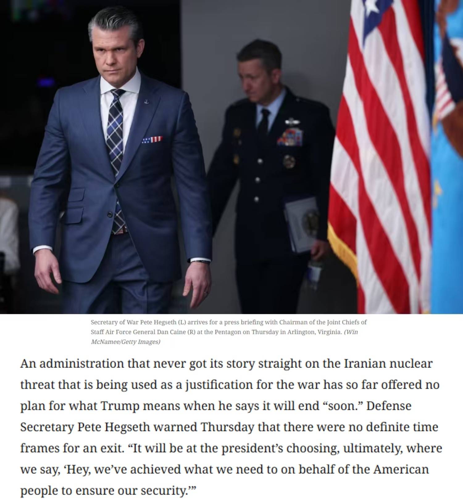 文章称,一个在伊朗“核威胁”问题上从未理清自己说法的政府,目前也没有对美国总统特朗普之前所说的“战争将很快结束”提出任何计划。美国国防部长赫格塞思此前称,目前还没有明确的撤军时间表。而目前议员们却即将面临政府提出的高达至少2000亿美元的战争经费申请。