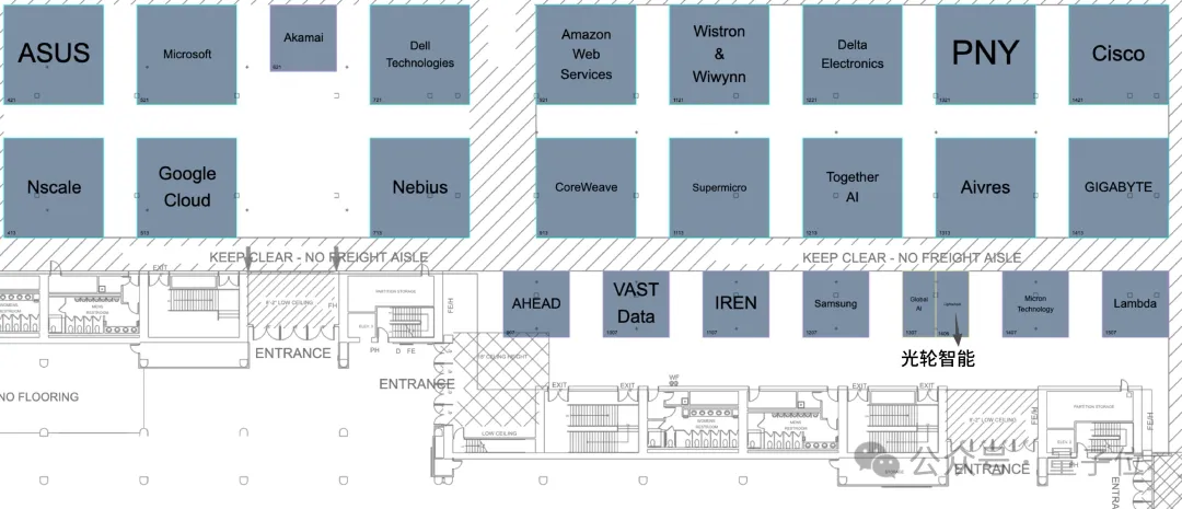 光轮的展台Booth 1406,位置也是相当核心,就在入口一进来的地方,旁边就是三星、美光等存储芯片巨头,还有Together AI、Lambda、Global AI等AI Infra重量级玩家。