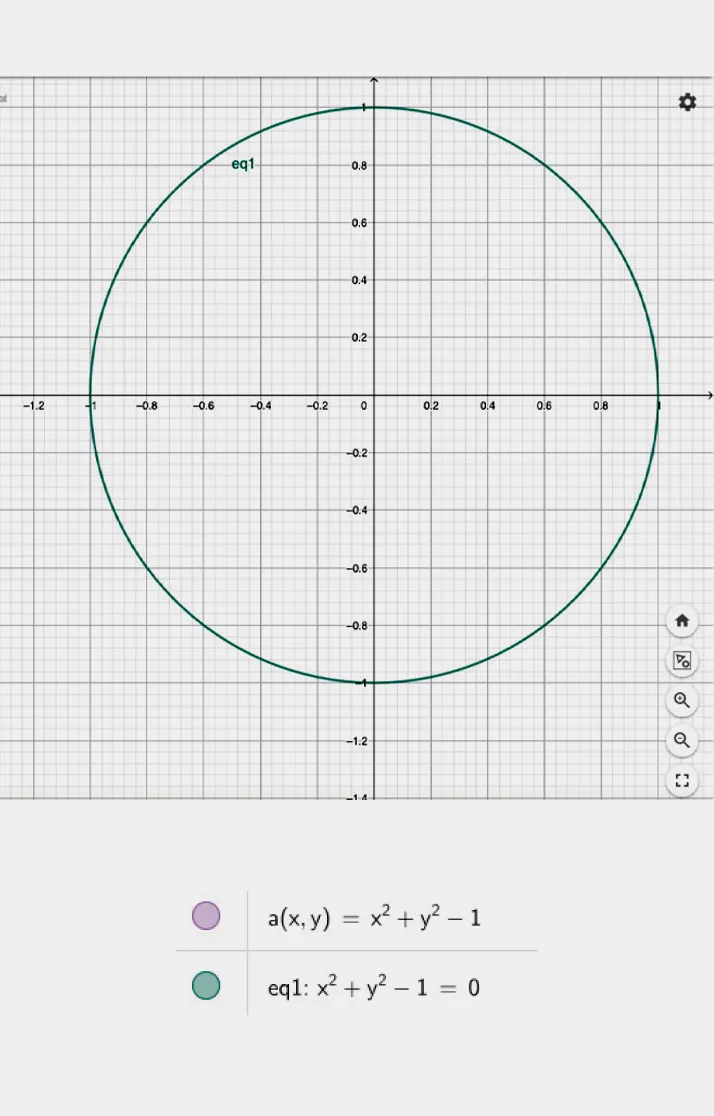 方程可以表示为点的集合:方法是把方程写成函数,再把它的解画成坐标点。例如,方程 x² + y² - 1 = 0,可以写成 f(x,y) = x² + y² - 1,然后研究这个函数在什么地方等于零,也就是研究 f(x,y) = 0。