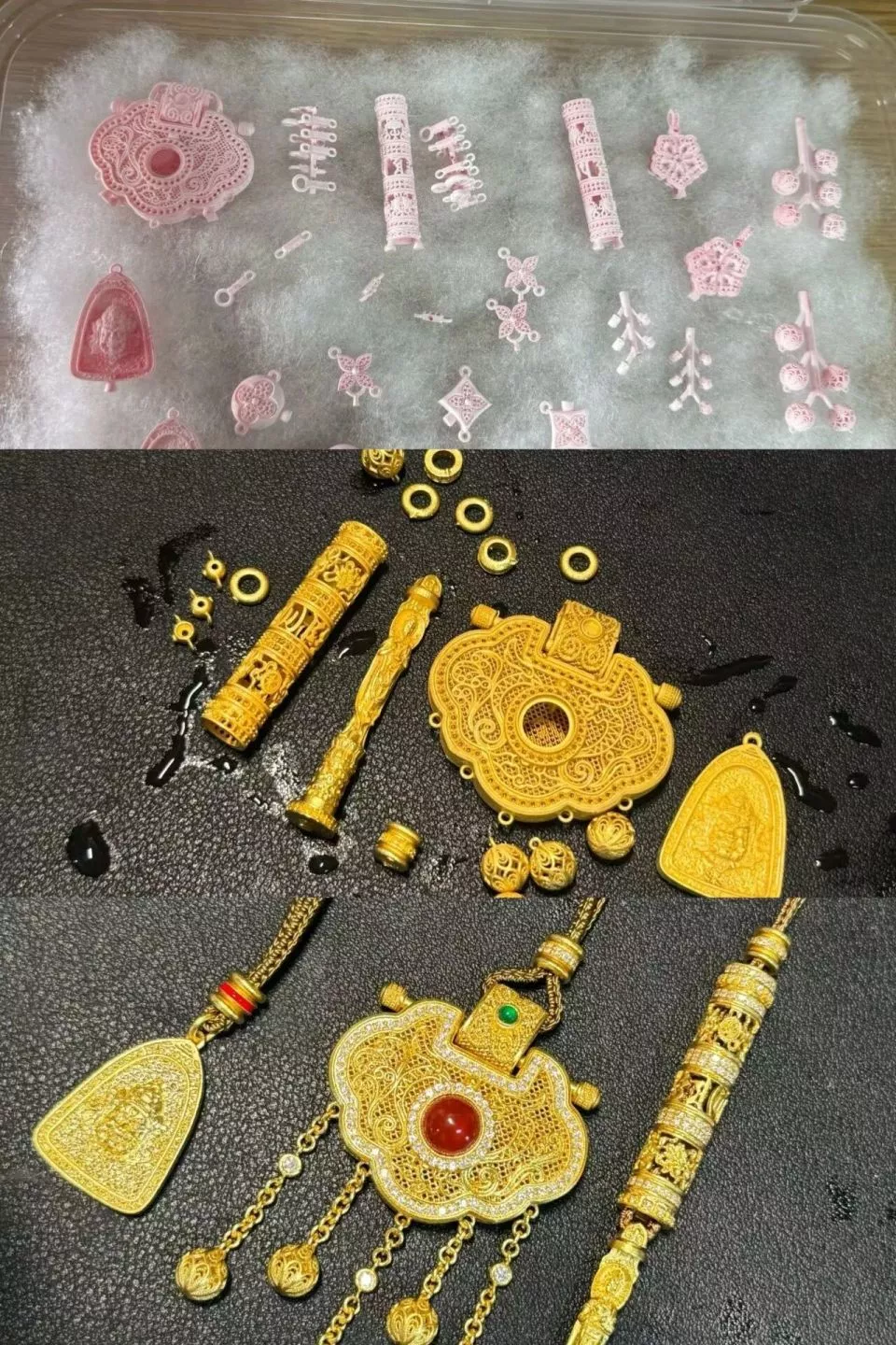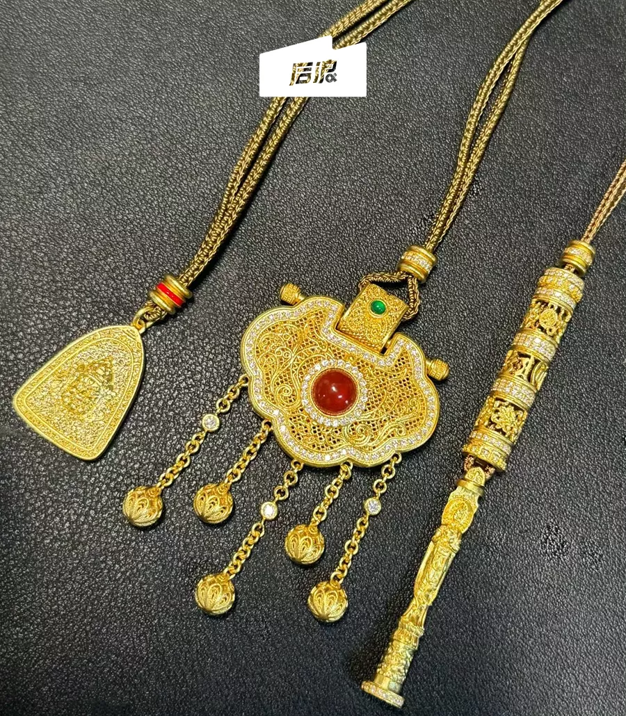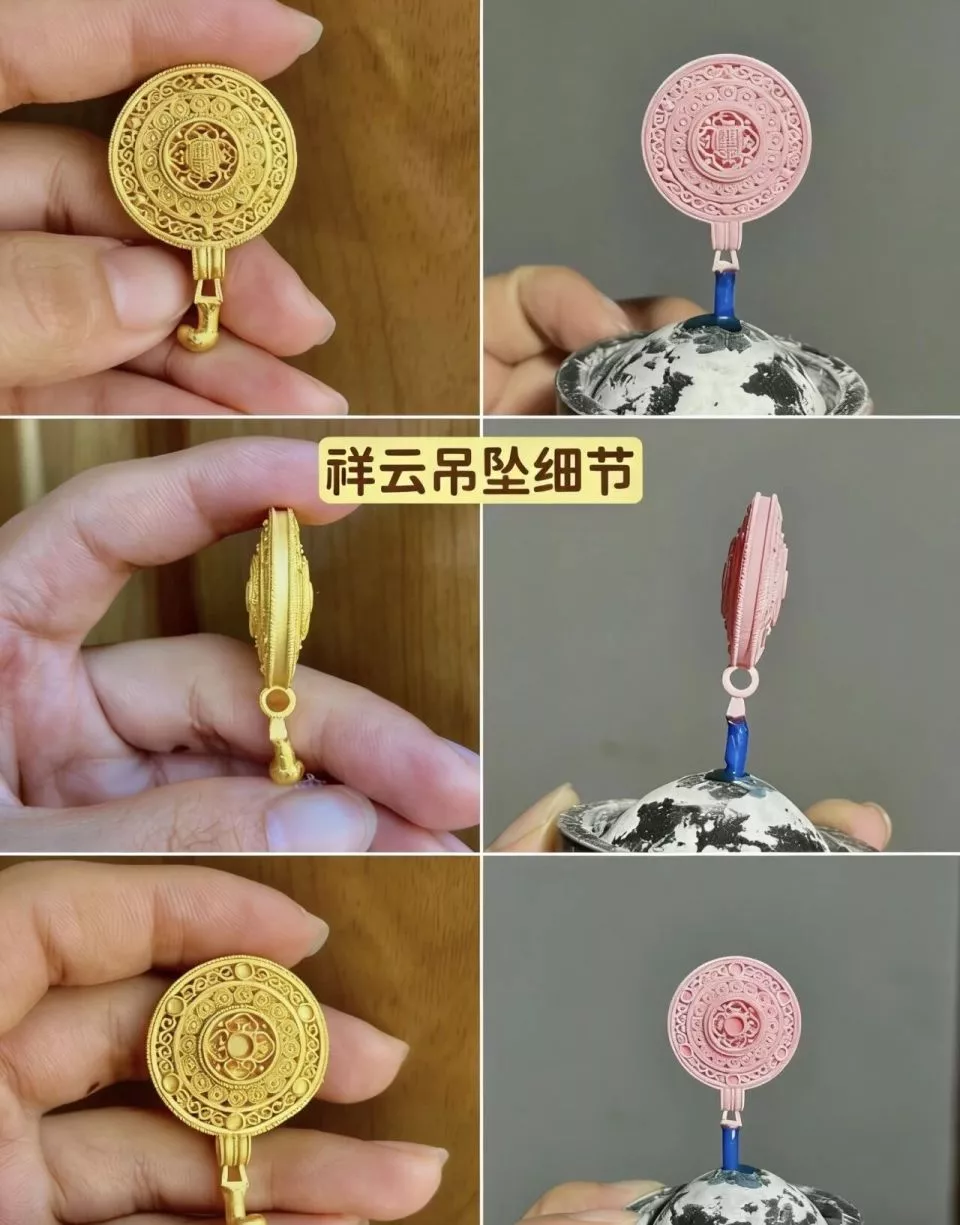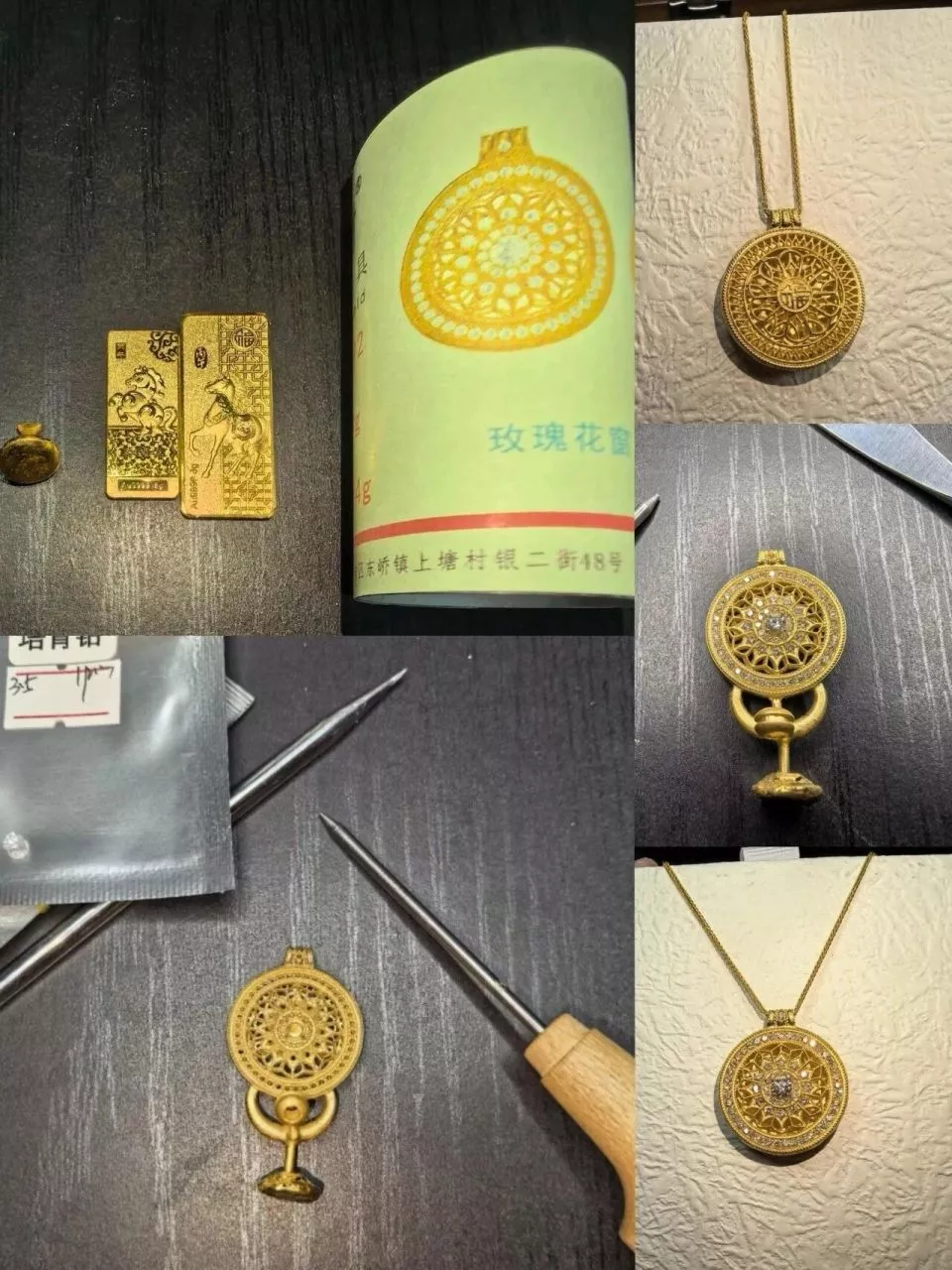 同时,有人也会追求进阶版的镶钻、花丝珐琅等更复杂的打金工艺。阿福从网上淘了一把2元一颗的锆石,用镊子一点点镶在素金上。如果要做类似八宝罗盘的款式需要用到珐琅彩,花几块钱就可以买到各种颜色的低温珐琅釉料,“放在美甲灯下面烤一烤。”