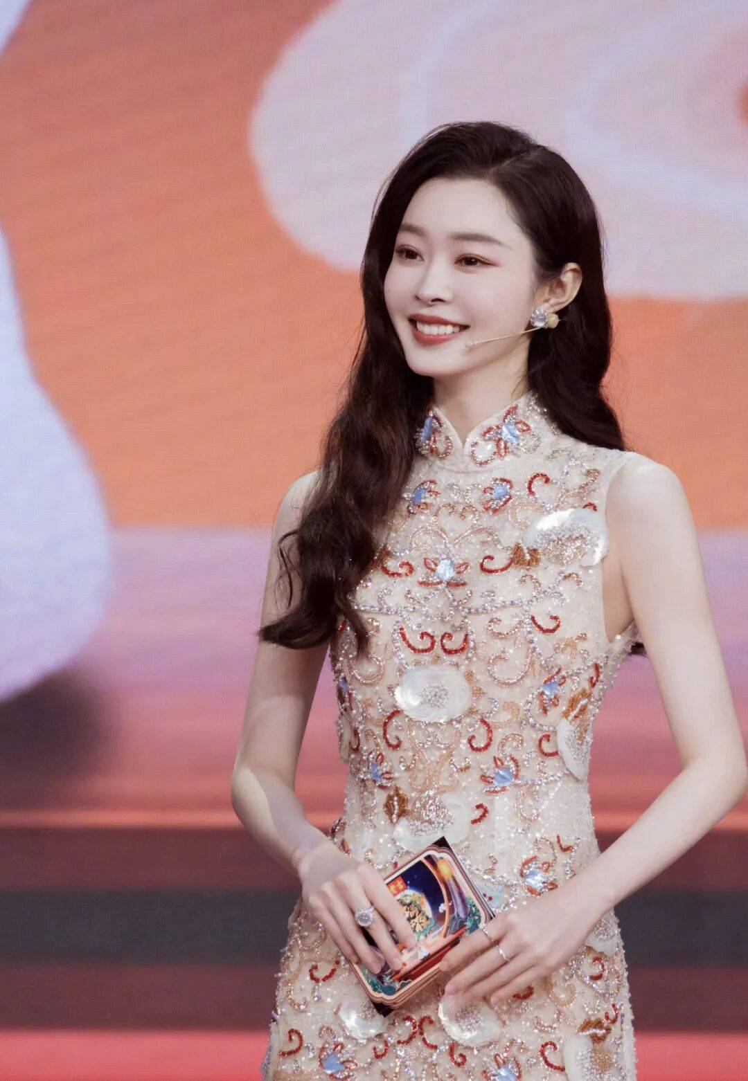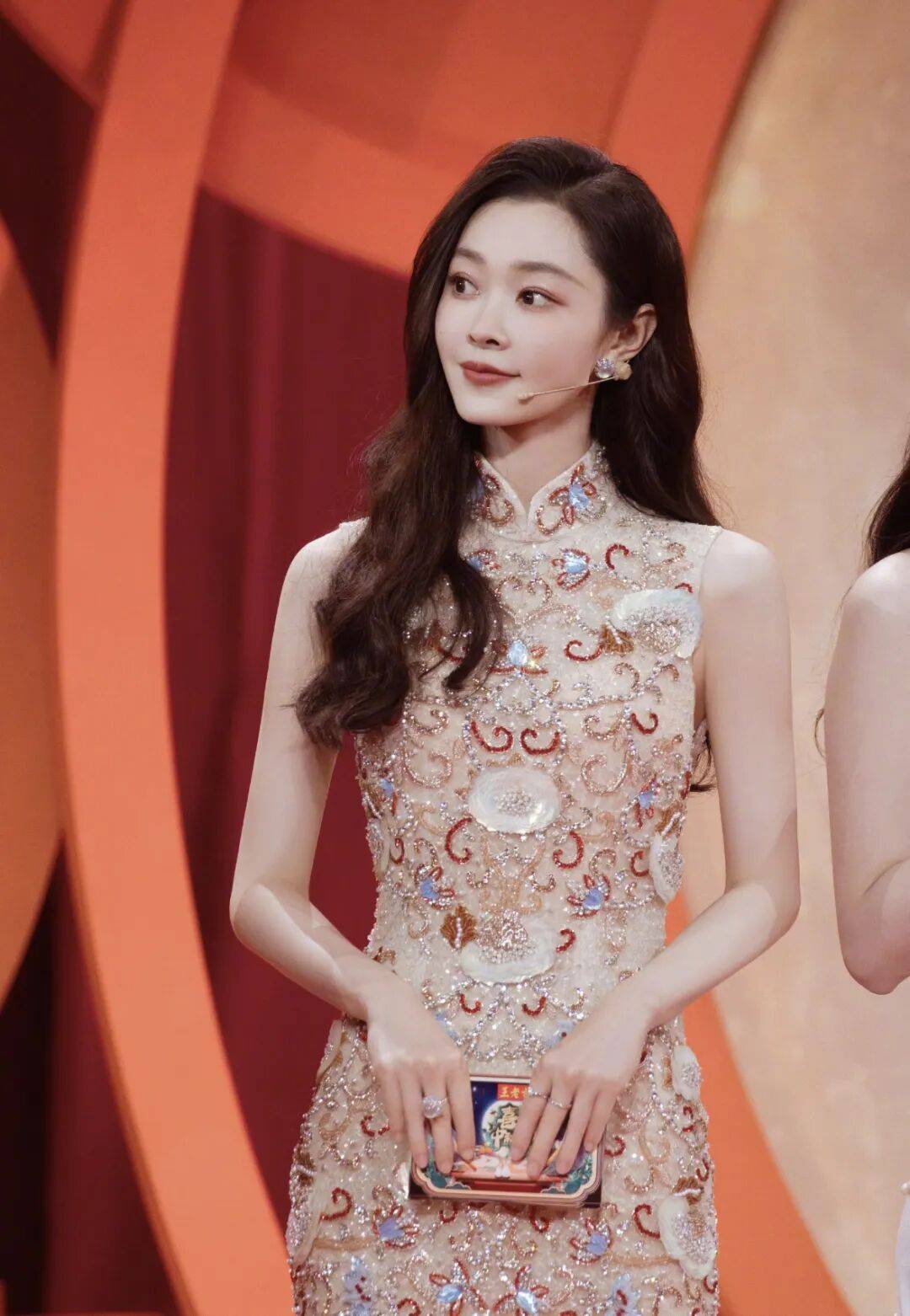宋轶的裸色旗袍以珠绣底布为基底,像一层温柔的月光纱,衬得她肤色通透。无袖立领保留了经典的中式符号,精致的盘扣顺着领口延伸,端庄中露出纤细的肩颈线条。裙身铺满红金卷草纹刺绣与贝母亮片,细碎的珠钻流转着光泽,贵气却不张扬。立体贝母花瓣点缀其间,让素雅的裸色多了几分灵动。
