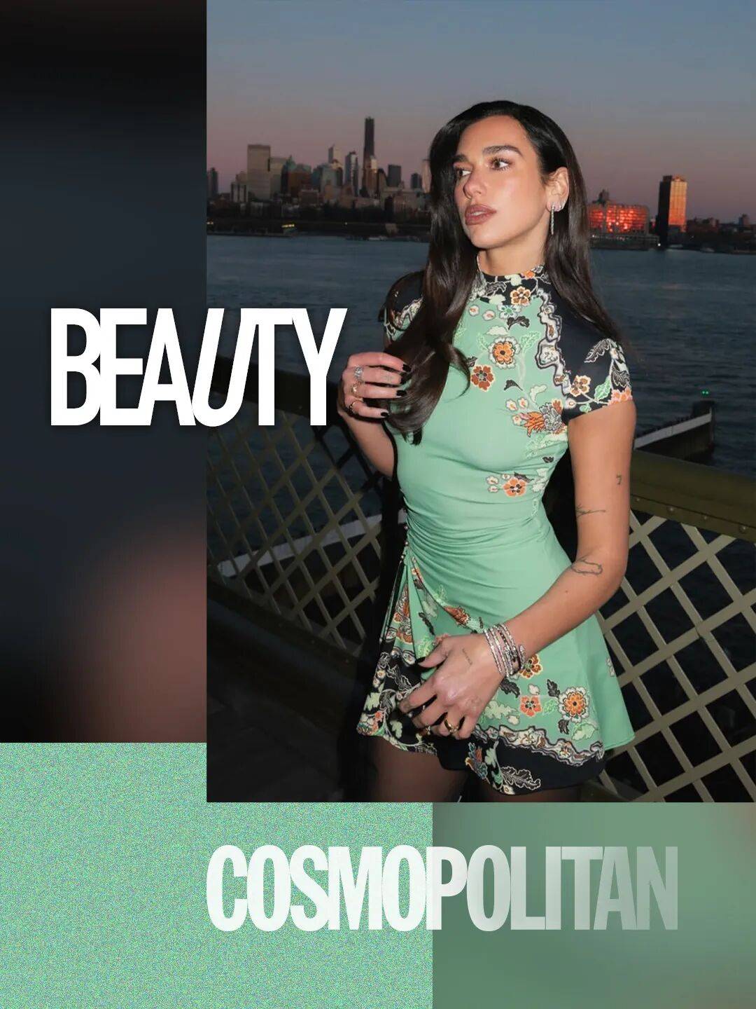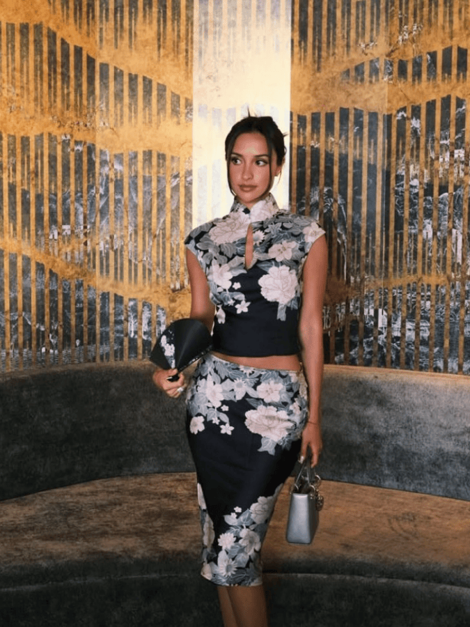 易梦玲身着立领造型和盖肩袖的短款旗袍,保留了中式骨架,但墨黑与豆绿的色块交错,把东方含蓄的性感变成了外放的辣妹感。裙身铺满重工花卉刺绣,牡丹、枝叶纹样顺着腰线蔓延,金棕与橘色的点缀让复古感拉满。