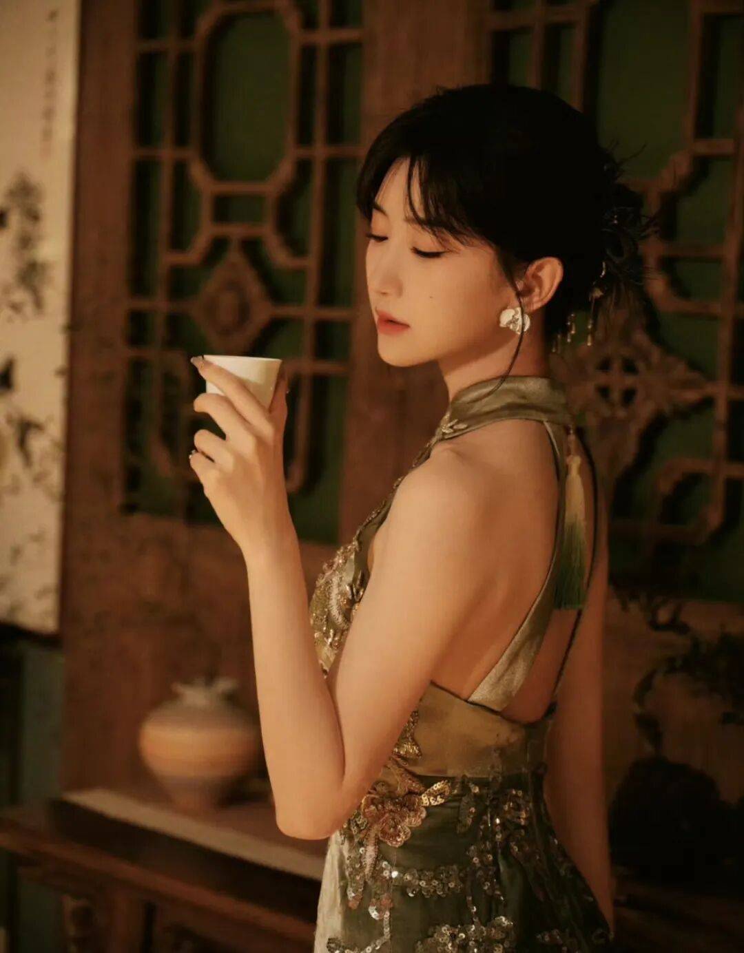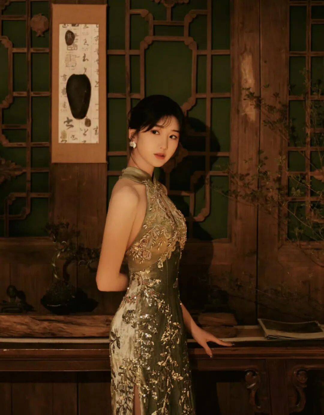 毛晓彤身着的改良旗袍褪去了传统的厚重,用橄榄绿丝绒打底,像把春日的青苔与茶烟揉进了面料,自带柔光滤镜。挂脖露背设计是点睛之笔,纤细的肩带勾勒出蝴蝶骨,后颈垂落的渐变绿流苏,随着动作轻晃,像风中摇曳的柳丝,把中式含蓄的性感拿捏得恰到好处。