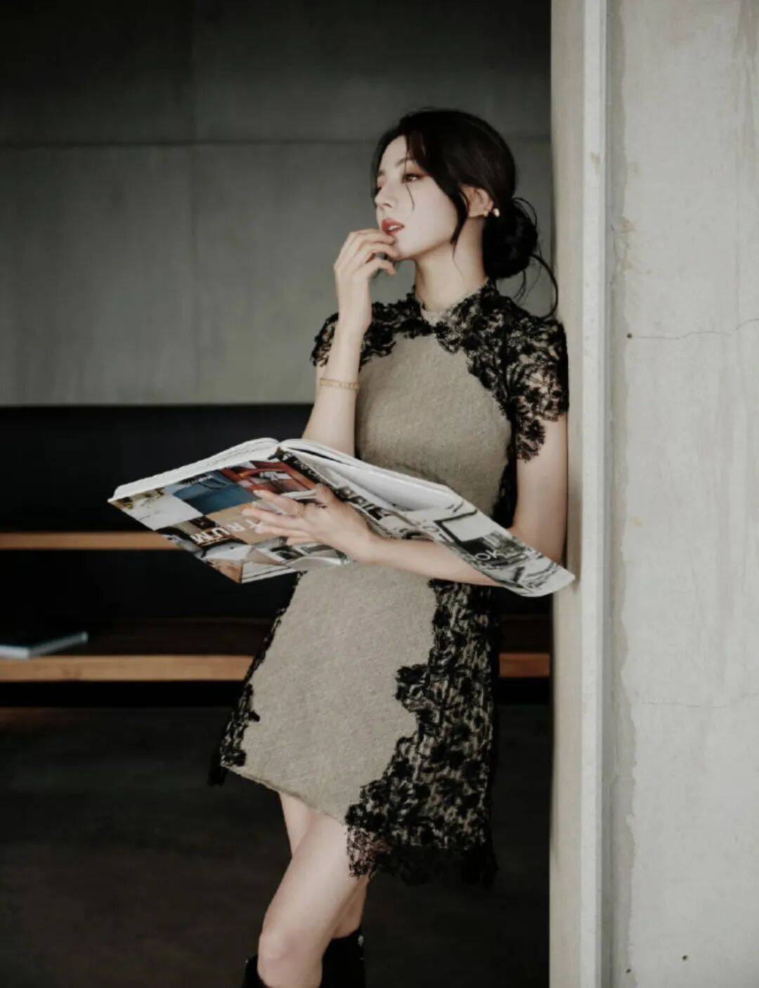 迪丽热巴这袭旗袍以浅卡其色粗纺面料为基底,自带复古肌理感。经典的剪裁保留了旗袍的端庄,而黑色蕾丝的大胆解构,则把中式含蓄的性感变成了利落的都市感。不对称的拼接设计与下摆的蕾丝毛边,打破了传统旗袍的规整感,让它既能适配红毯,也能走进日常街角。
