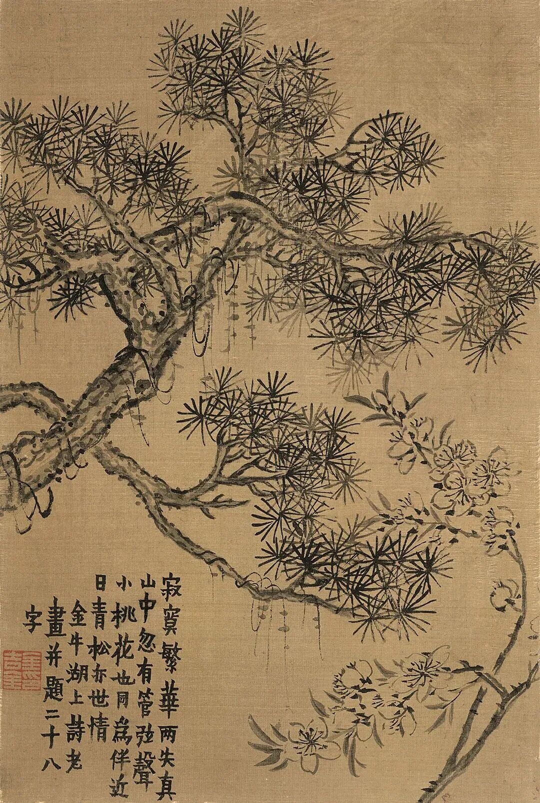 寂寞繁华两失真,山中忽有管弦声。小桃花也同为伴,今日青松亦世情。金牛湖上诗老画并题二十八字。