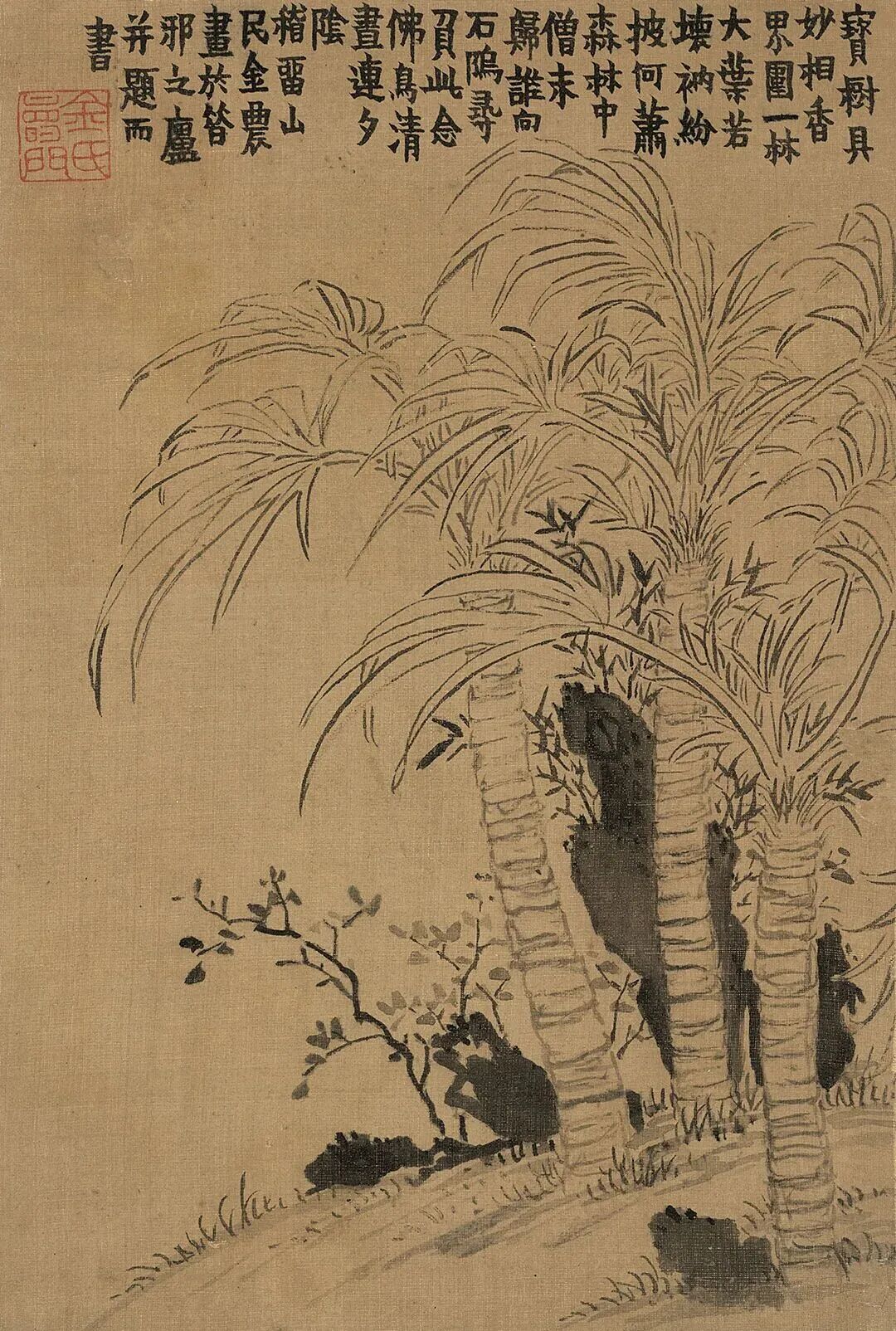 宝树具妙相,香界围一林。大叶若坏衲,纷披何萧森。林中僧未归,谁向石坞寻?负此念佛鸟,清昼连夕阴。稽留山民金农画于昔邪之庐并题而书。