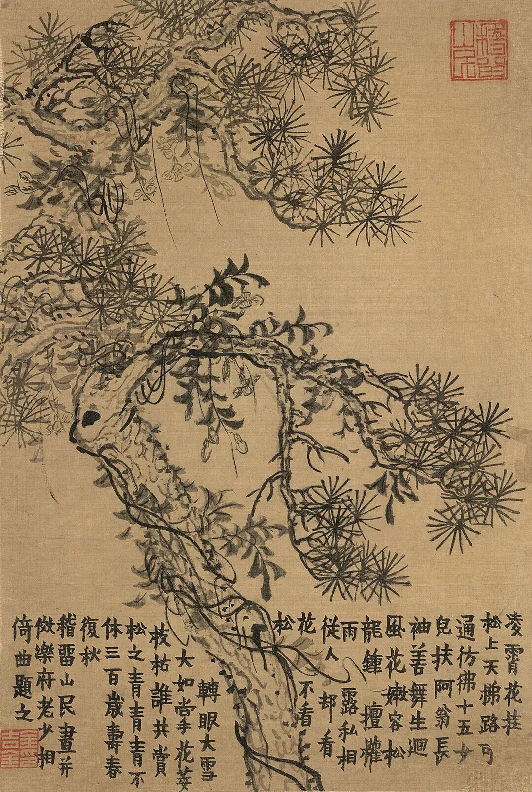 凌霄花挂松上,天梯路可通。仿佛十五女儿扶阿翁,长袖善舞生回风。花嫩容,松龙钟。擅权雨露私相从,人却看花不看松。转眼大雪大如掌,花萎枝枯谁共赏?松之青青青不休,三百岁寿春复秋。稽留山民画并效乐府老少相倚曲题之。