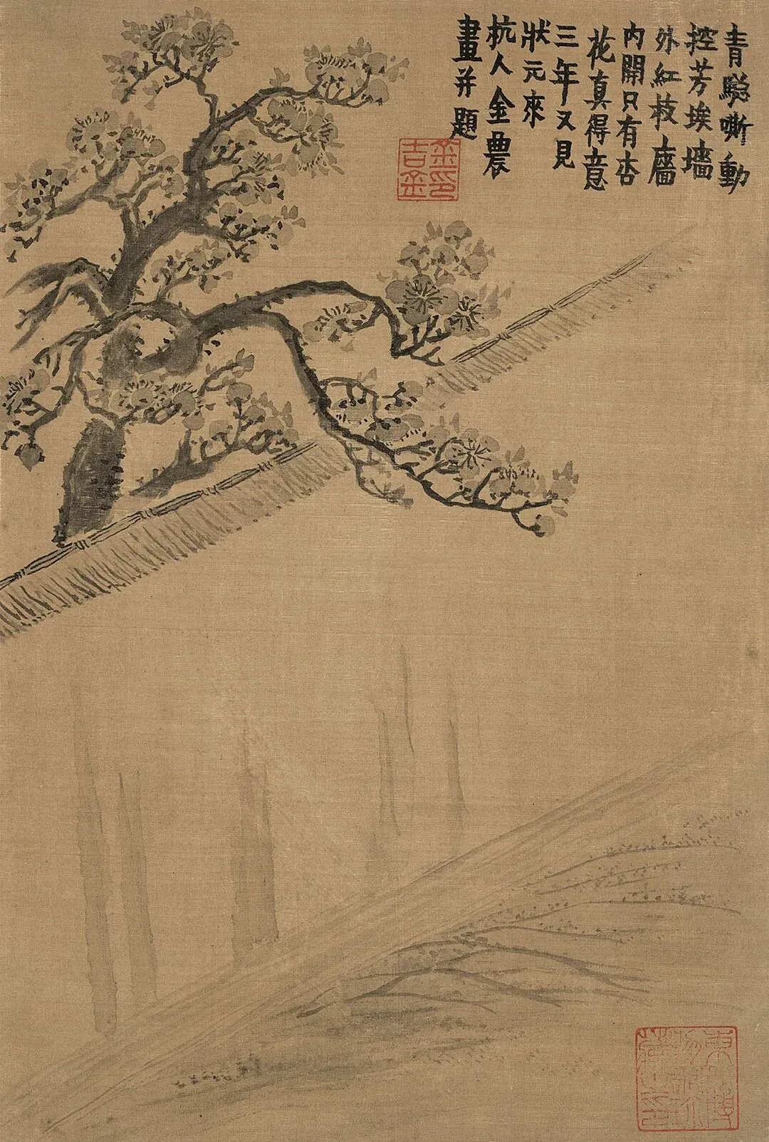 青骢嘶动控芳埃,墙外红枝廧内开。只有杏花真得意,三年又见状元来。杭人金农画并题。