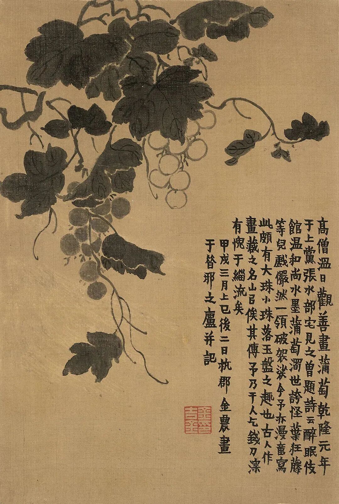 高僧温日观善画蒲萄。乾隆元年于上党张水部宅见之,曾题诗云:“醉眠伎馆温和尚,水墨蒲萄浊世夸。怪叶狂藤等儿戏,俨然一领破袈裟。”今予亦漫意写此,颇有“大珠小珠落玉盘”之趣也。古人作画,藏之名山,以俟其传。予乃于人乞钱刀,深有愧于缁流矣。甲戌三月上巳后二日杭郡金农画于昔邪之庐并记。