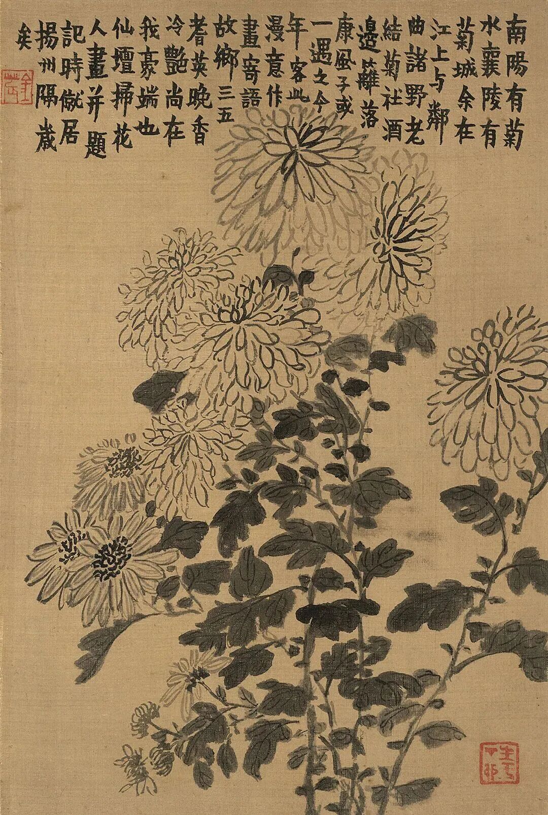 南阳有菊水,襄陵有菊城。余在江上与邻曲诸野老结菊花社,酒边篱落,康风子或一遇之。今年客此,漫意作画,寄语故乡。三五耆英,晚香冷艳,尚在我豪端也。仙坛扫花人画并题记时僦居扬州隔岁矣。