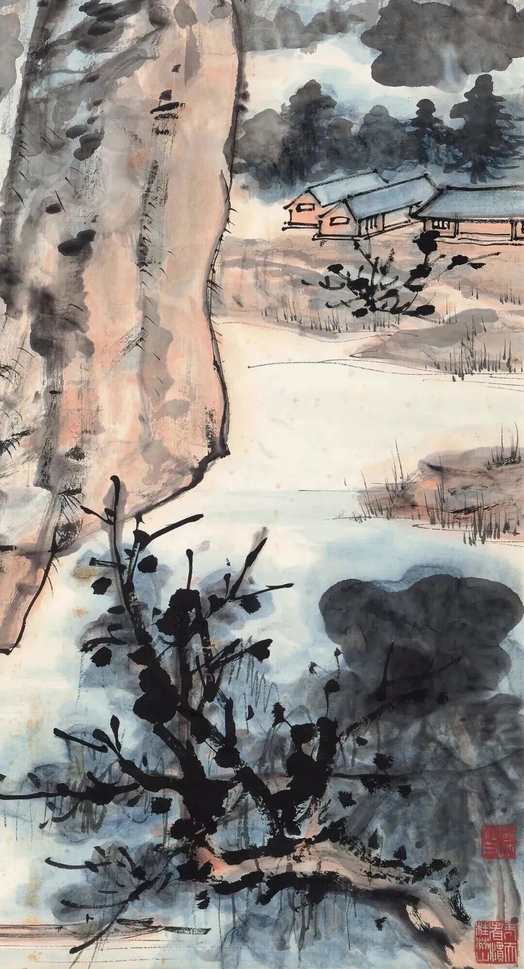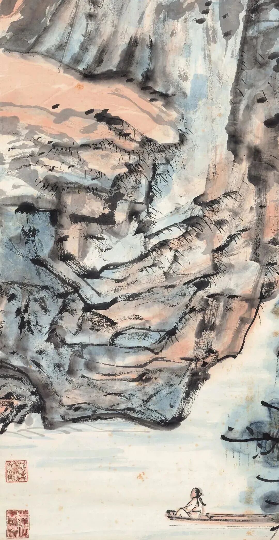 右下角老树探出来,树下小船载着高士,这高士怕不是被这美景“迷晕”了,在那儿感叹江山奇景呢!张大千画这山石,线条粗豪奔放,跟写狂草似的,远山云树用泼墨一染,块面结构整得明明白白,不搞层层染那一套,线条和墨韵混一块儿,浑然天成。