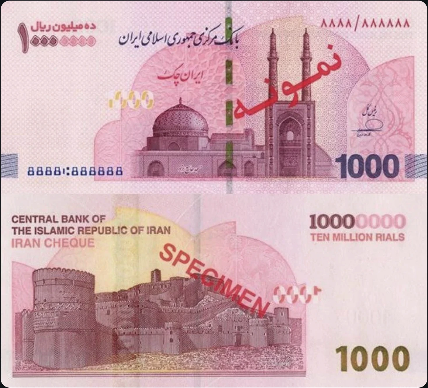 报道指出,新版的千万面额货币,正面图案为建造于9世纪的亚兹德清真寺(Jameh Mosque of Yazd),背面则是位于伊朗东南部、列名联合国世界文化遗产清单之中,具有2500年历史的巴姆古城(Bam Citadel),其面额则是超过了甫于2月初发行的500里亚尔纸钞,创下伊朗货币最高面额的新记录。