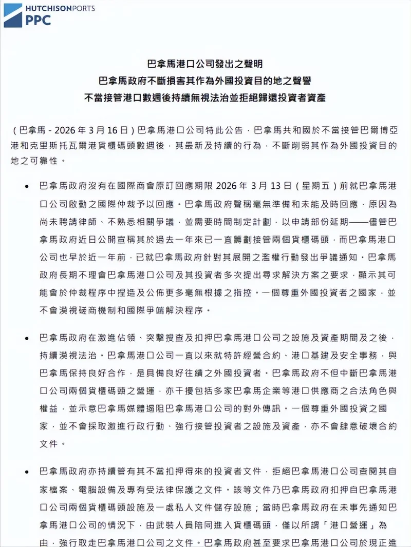 长和旗下巴拿马港口公司PPC星期一(16日)说,国际商会(ICC)旗下的国际仲裁庭为上述仲裁程序定下3月13日的回应期限。巴拿马政府以未聘请律师,无法正常参与仲裁流程,需要时间准备为由,申请部分延期。暗示政府在此次争议中存在失职与拖延行为。