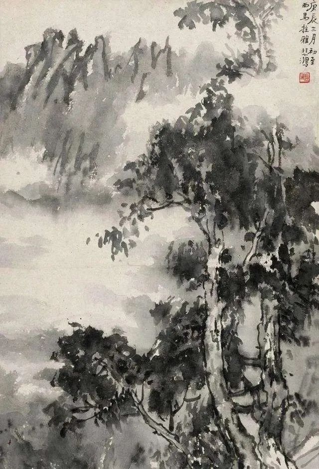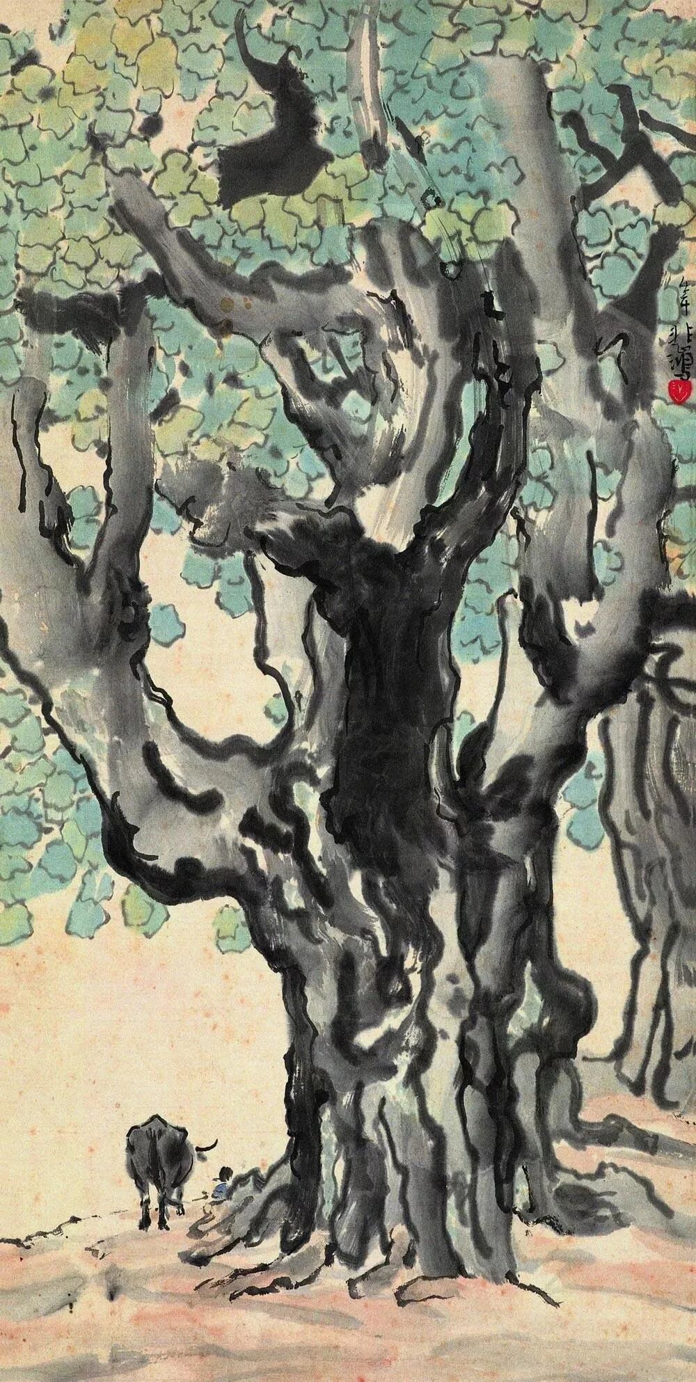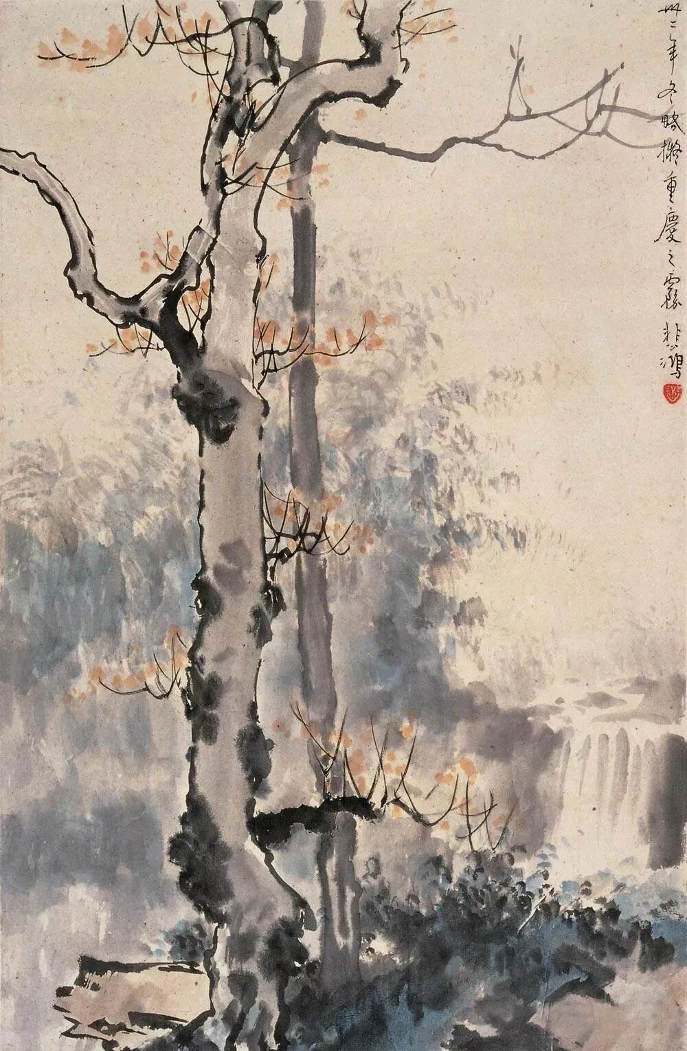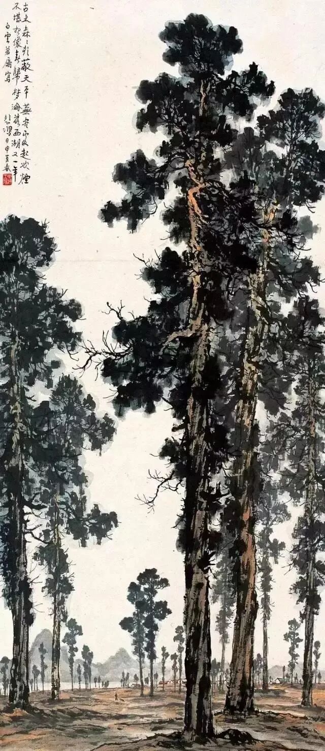 徐悲鸿山水画中对树的描绘颇为讲究用笔,特别是松柏,多采用湿笔,墨色有干湿浓淡的变化,温润浑融。他曾在给陈子奋的信中说道:“写树以淡墨先效树身,再乘湿施钩勒,则树必奇古”。他不特别追求笔力,而更注重追求色调的和谐与充足的水分,所以在风格上极少剑拔弩张或沉郁顿挫,代表作品有《松月图》和《古柏长春》。