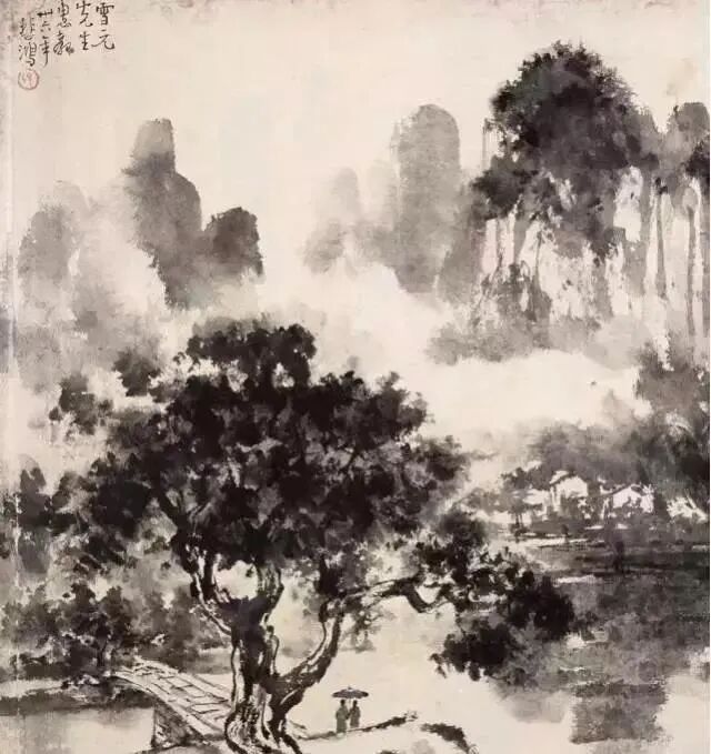 徐悲鸿的山水画为数并不多,但师法传统,尊重传统精神。他对古代凡有创造性的画家,推崇备至,经常教育学生多看优秀的名作,要求记下他们的名字,象唐代的王维,五代的荆浩,宋代的董源、范宽、李成、米元章、夏圭,明代的沈周,清代的石溪、石涛等。