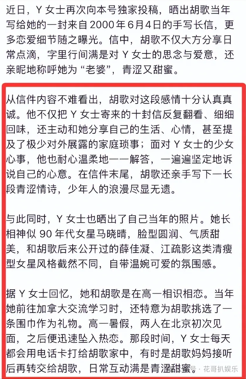 这次曝光的主角是胡歌的初恋Y女士,两人在2000年相恋。那时胡歌还在为考上戏全力备考,青涩少年怀揣着演员梦,和远在北京的Y女士靠着一封封手写书信,开启了一段纯粹的异地恋。
