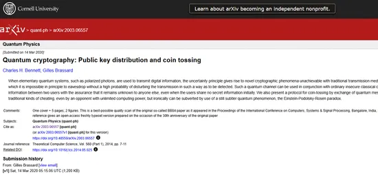 布拉萨德虽然此前对物理没兴趣,但听完居然没跑,反而被这种方法迷住了。两人开始合作,最初是想把贝内特的想法从钞票改成更简单的东西,也就是地铁代币。1983年,他们发表论文论证了量子地铁代币不可能被伪造,就算有人偷了包含复杂读取硬件的检票机也没用。