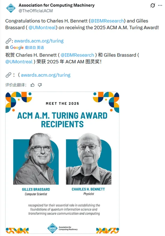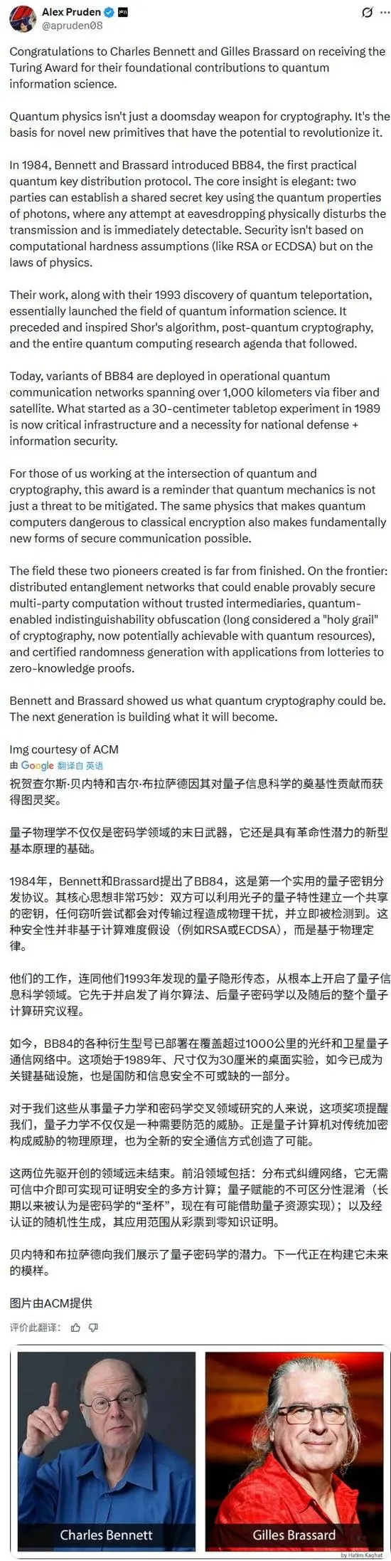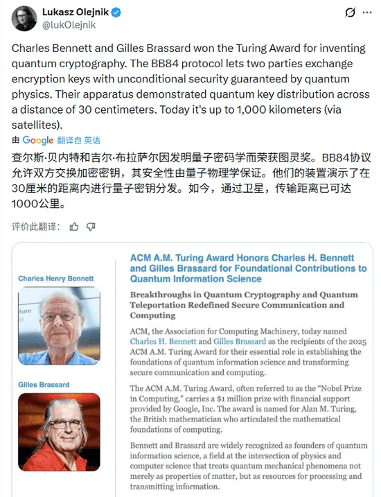 今年计算机界的最高荣誉图灵奖(ACM A.M. Turing Award)已经尘埃落定,美国物理学家查尔斯·贝内特(Charles H. Bennett)和加拿大计算机科学家吉勒·布拉萨德(Gilles Brassard)共享了这一殊荣。