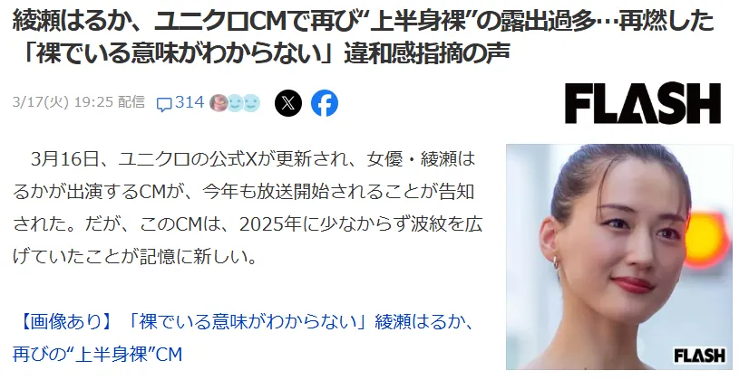 起因是3月16日,优衣库官方X账号发布更新,po出了一条由演员绫濑遥出演的新广告。