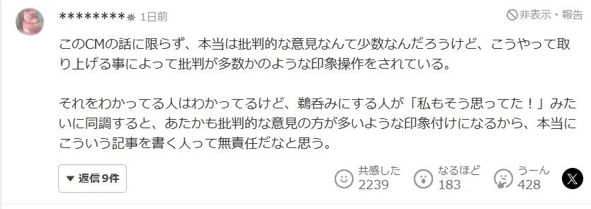 不管男女,批判的激烈程度是否一样呢?广告(CM)本身就有“只要吸引眼球就好”的意图。