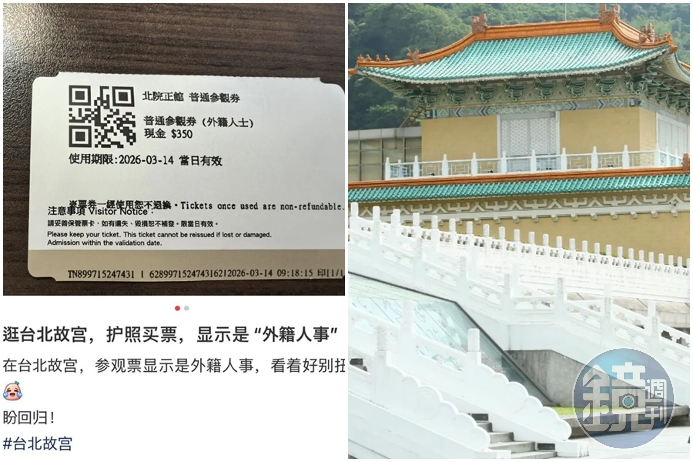 一名中国籍女子赴国立故宫博物院参观,却因票面印有“外籍人士”4字崩溃发文公审。(翻摄自小红书、本刊资料照)