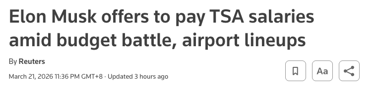 “鉴于此次拨款僵局正对全美各地机场众多美国人的生活造成负面影响,我愿在此期间承担TSA人员的薪资,”马斯克在其社交媒体平台X上发文表示。