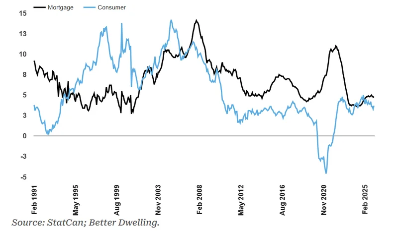 加拿大家庭已开始主动 “踩刹车”:抵押贷款增速见顶停滞,消费信贷增长急剧放缓。经济尚未从近期逆风中完全复苏,而家庭部门已不愿再等待转机,选择缩减借贷、收紧开支。