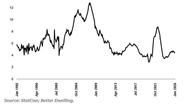 由于住房市场占加拿大 GDP 比重较高,抵押贷款增速停滞将直接拖累建筑、金融等多个行业。这种放缓并非短期波动,而是更深层的结构性阻力,无法仅凭降息或短期刺激政策轻易扭转。