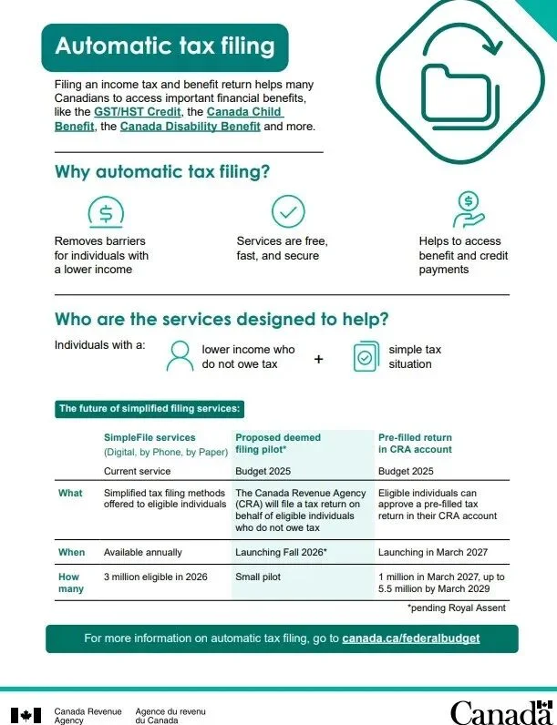 如果相关法案获得御准(Royal Assent),政府计划在今年秋天推出一个试点项目,目前被称为“自动报税试点”(proposed deemed filing pilot)。在该计划下,对于符合条件且不欠税的人,CRA可以直接代为完成报税,除非当事人选择退出。