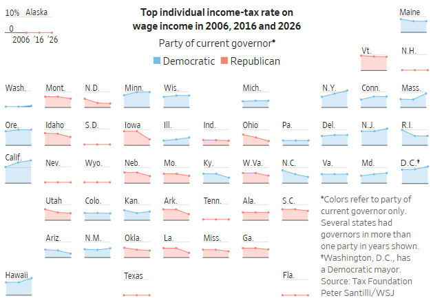 中间路线正在迅速消失。根据倾向于低税率的智库“税收基金会”(Tax Foundation)的数据,2006年时,有15个州的最高工资所得税率低于5%,仅有1个州超过10%。如今,超过一半的州税率已低于5%,而另有5个州及哥伦比亚特区的税率则达到两位数。
