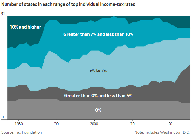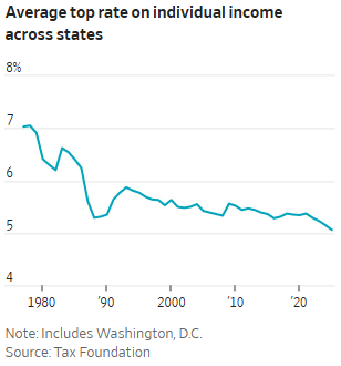 由共和党执政的州正相互竞争,推动税率扁平化、下调甚至取消个人所得税。自2021年以来,已有23个州下调了最高所得税税率。密西西比州和俄克拉荷马州等地已走上取消个人所得税的路径。南卡罗来纳州今年计划将最高税率降至1.99%,而密苏里州居民可能在今年11月就一项逐步取消所得税、同时扩大销售税的方案进行投票。